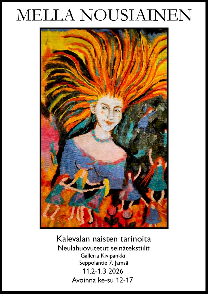 Artesaani Mella Nousiaisen neljäs yksityisnäyttely Kalevalan naisten tarinoita tuo Galleria Kivipankkiin neulahuovutettuja seinätekstiilejä, jotka tulkitsevat Kalevalan naishahmoja uusin näkökulmin.
