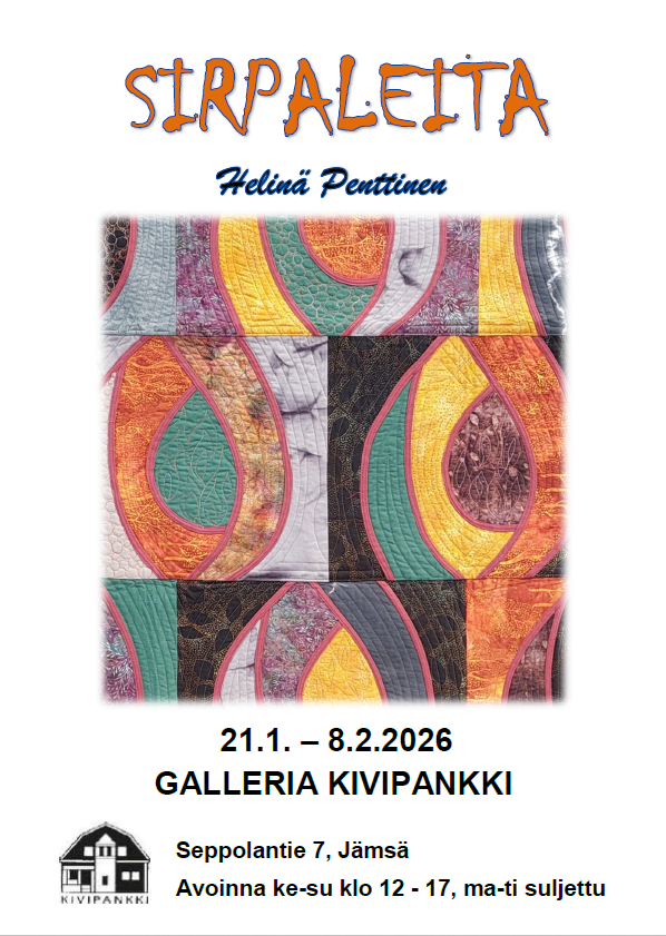 Helinä Penttisen taidenäyttely Sirpaleita koostuu perinteisistä tilkkutöistä, moderneista testiilitaiteeksi luokiteltavista töistä sekä akvarelleista. Tilkkutöihin hän tutustui asuessaan Japanissa vuosina 1987 – 1991. Tutuksi tuli amerikkalainen tilkkutyöperinne, kaikki tehtiin käsin ja töiden käsin tikkaaminen oli vielä useita vuosia Suomeen palaamisen jälkeenkin hänen töilleen ominaista.