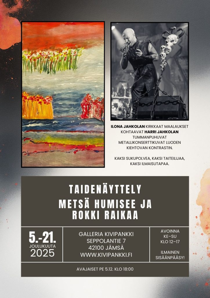 Ilona Jahkolan öljymaalaukset laulavat kirkkailla väreillä: metsät humisevat, abstraktit tunnelmat sykäyttävät ja maisemat hengittävät rauhallista kauneutta, jota vain yli 50 vuoden kokemus siveltimen kanssa voi synnyttää.