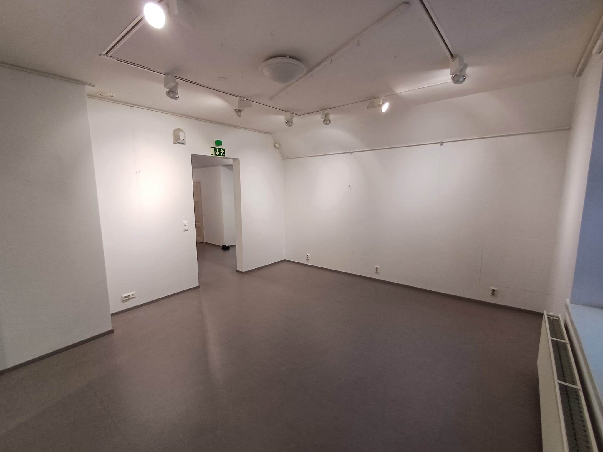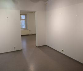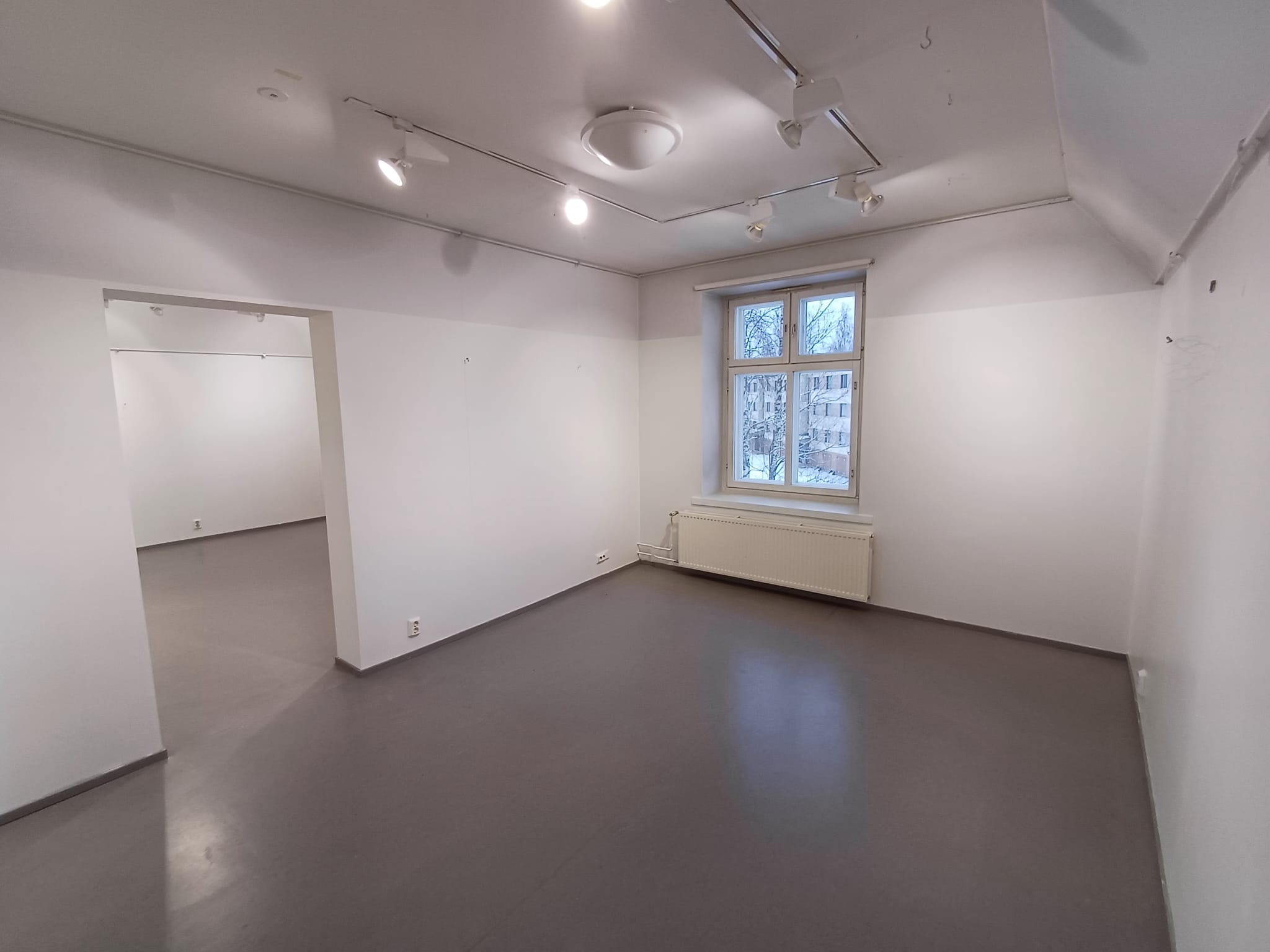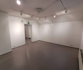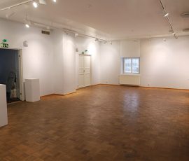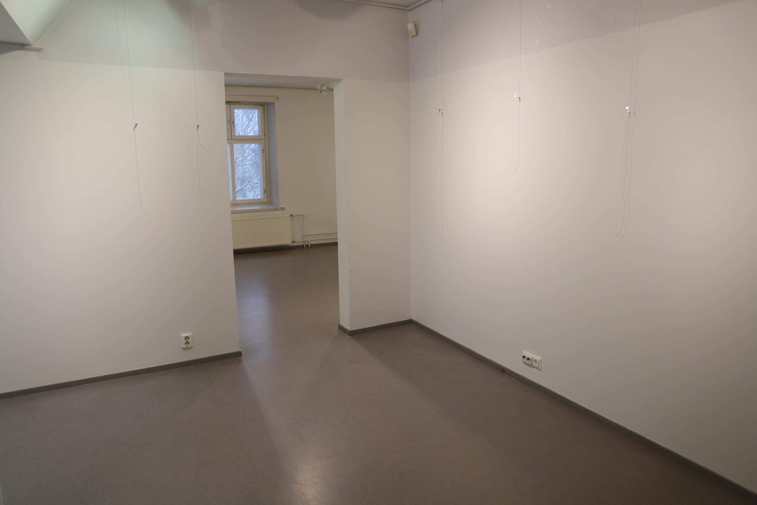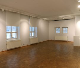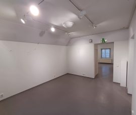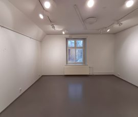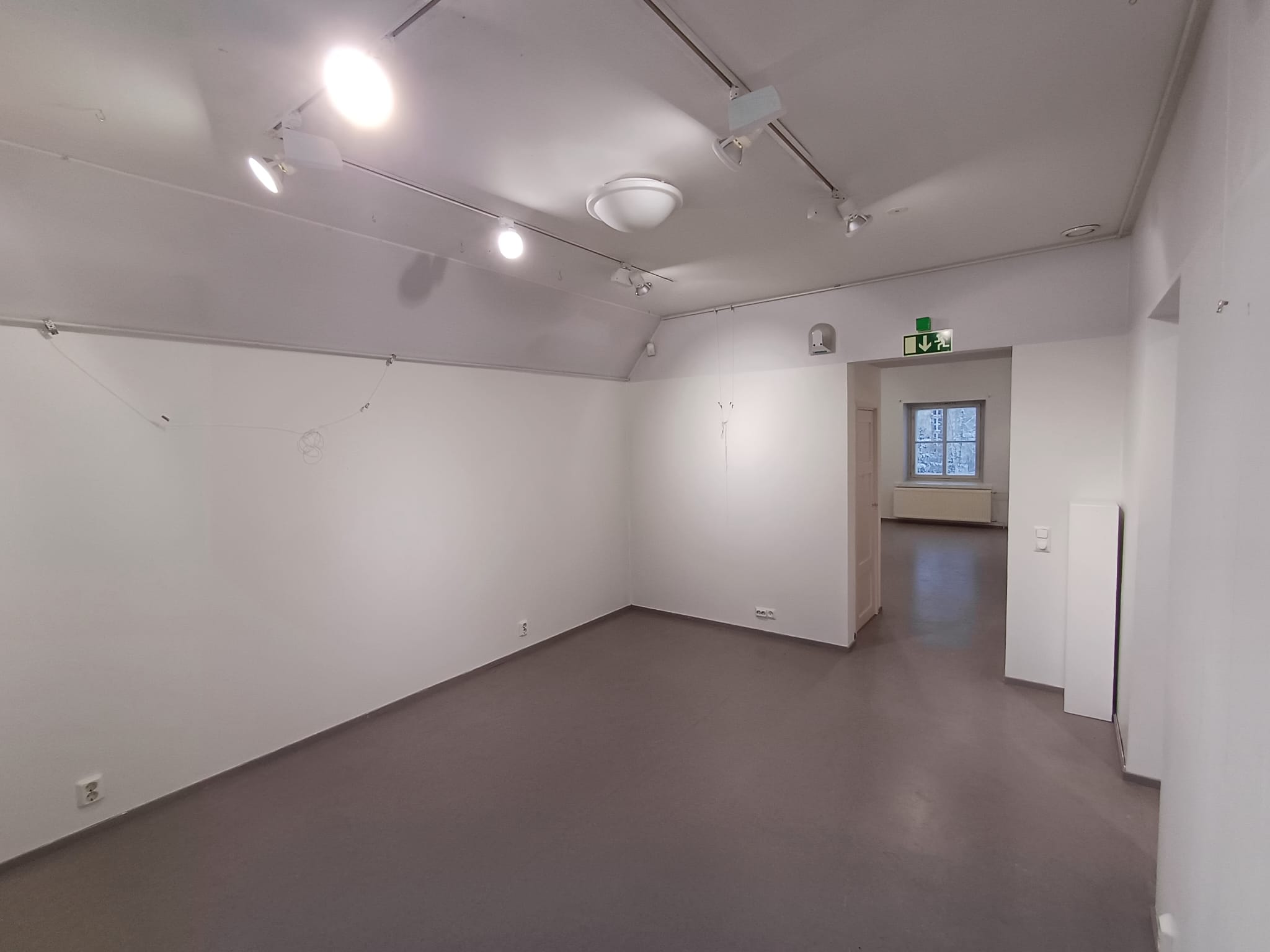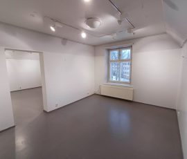 Yläkerta jakaantuu neljään eri näyttelyhuoneeseen yhteensä noin 80 m². Seinät ovat valkoiset ja lattialla on harmaa muovimatto.