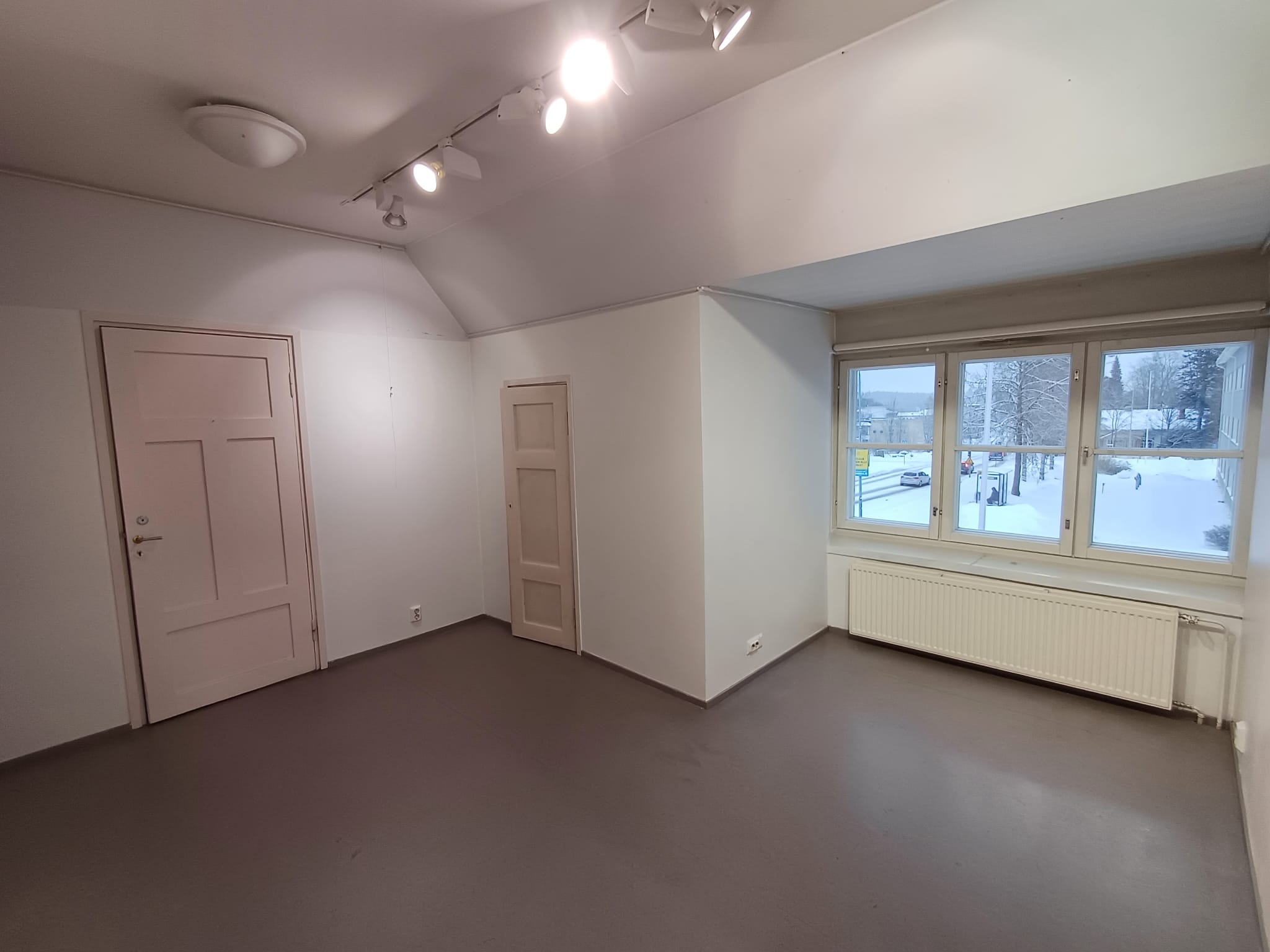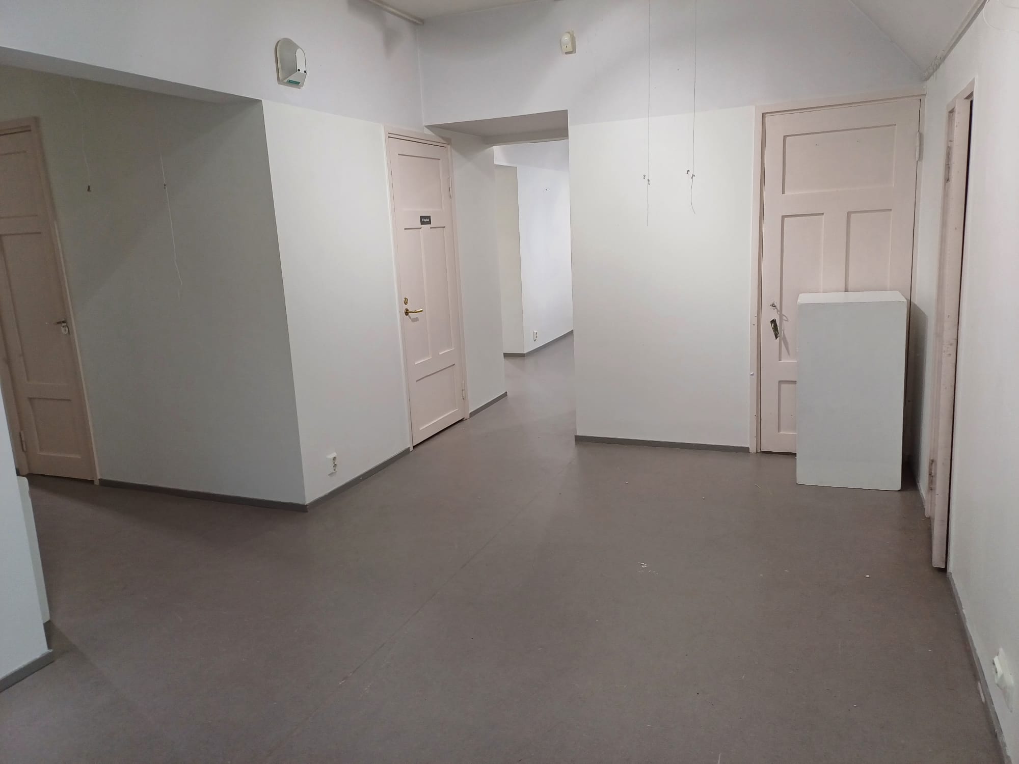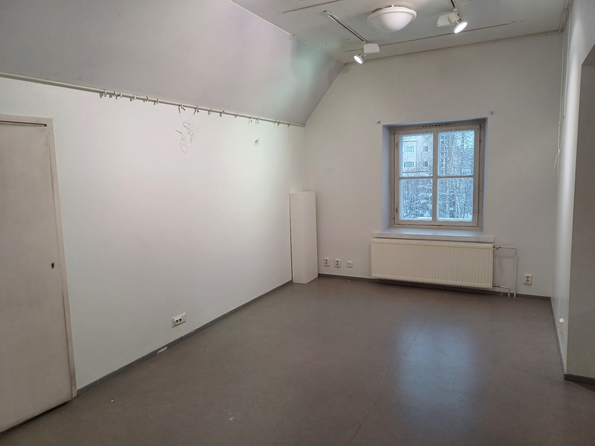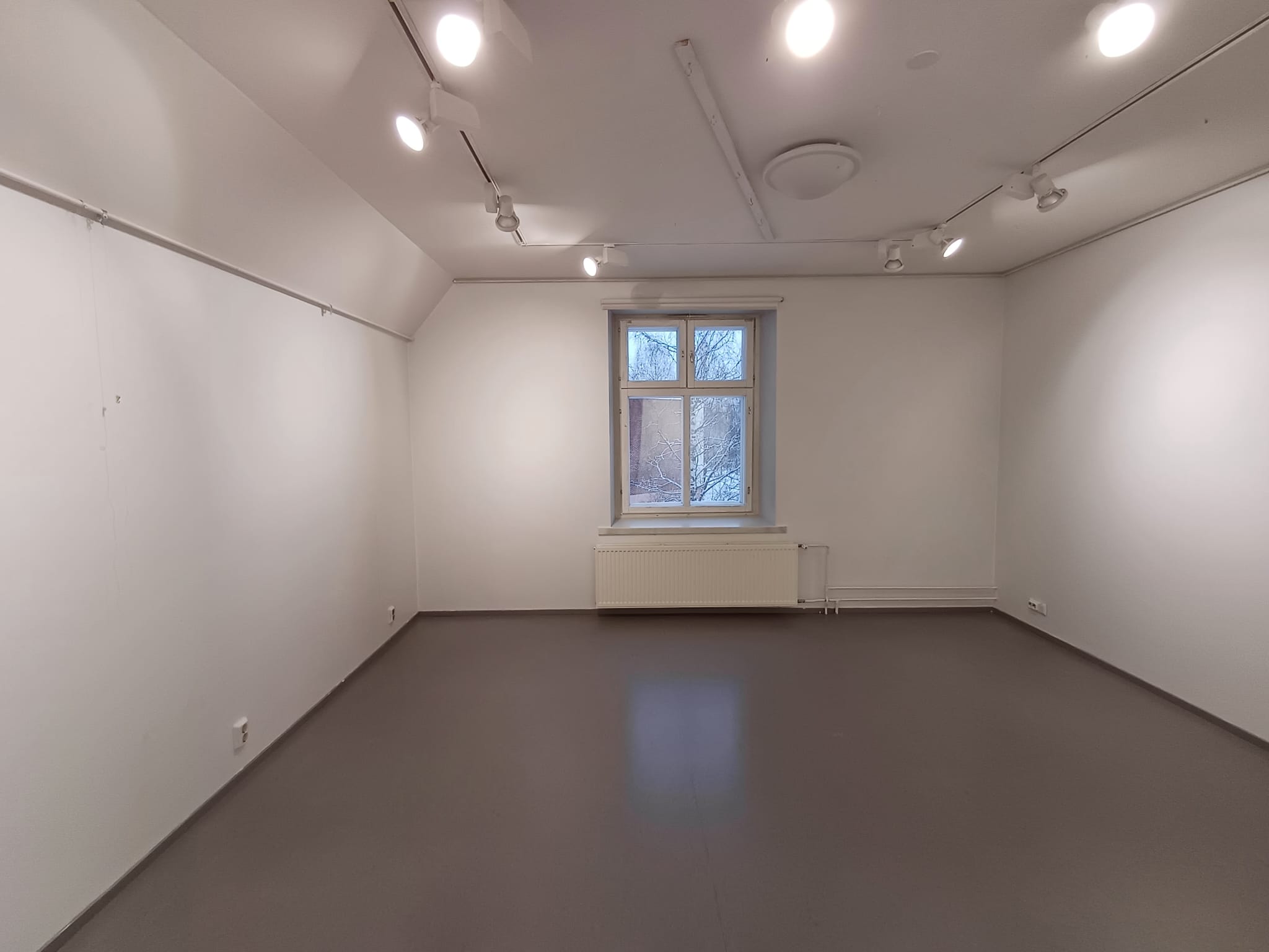 Yläkerta jakaantuu neljään eri näyttelyhuoneeseen yhteensä noin 80 m². Seinät ovat valkoiset ja lattialla on harmaa muovimatto.